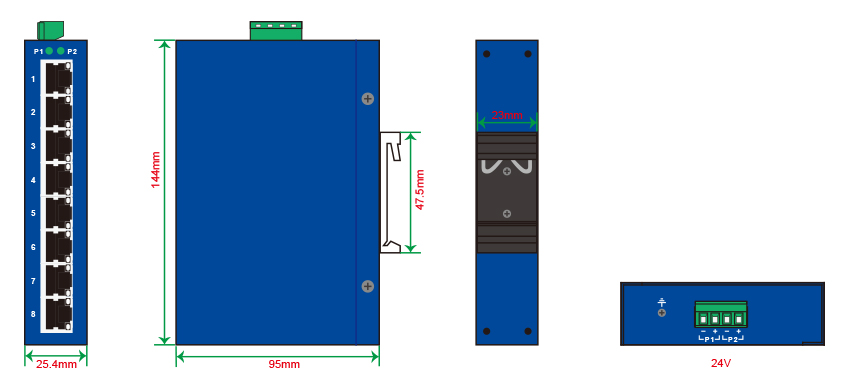 MX8E-8T是一款緊湊型百兆非網管工業以太網交換機,支持8個百兆電口。支持IEEE802.3/802.3u/802.3x,10/100M,全/半雙工,MDI/MDI-X自適應RJ45端口。導軌安裝,24V電壓輸入,并提供過載和反接保護。可選寬溫型號(-40 ~ +75℃),強抗電磁干擾能力,完全滿足苛刻的工業應用環境,為工業現場提供經濟可靠的網絡接入。
